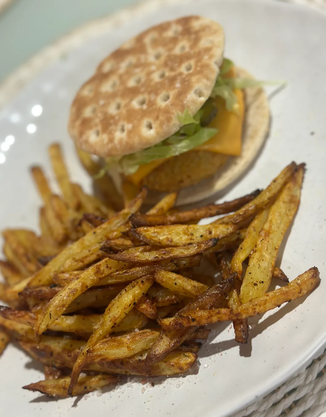 - Construct your burger with the remaining toppings and serve with fries ! 😍